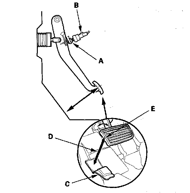 2. Pull back the carpet and the insulator cutout (C). Measure the pedal height (D) from the middle of the left side center of the pedal pad (E).
