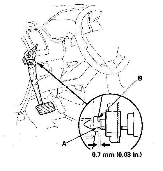 1. Disconnect the brake pedal position switch connector, loosen the brake pedal position switch locknut (A), and back off the brake pedal position switch (B) until it is no longer touching the brake pedal.
