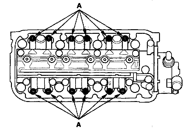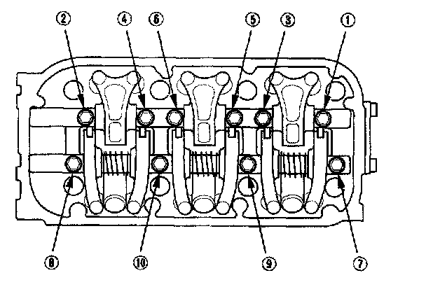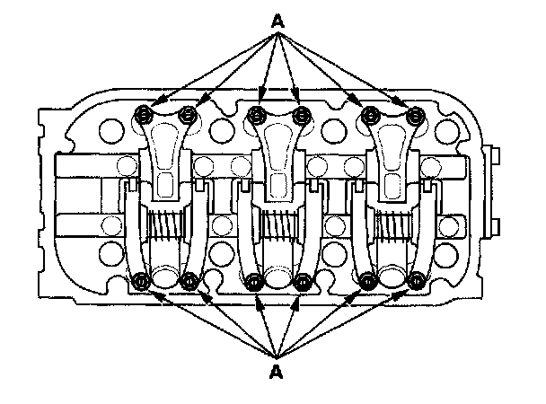- 2 When removing the rocker arm assembly, do not remove the rocker shaft mounting bolts. The bolts will keep the springs and the rocker arms on the shafts.