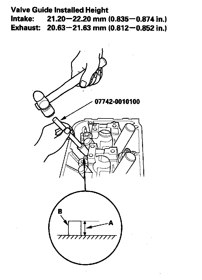 9. Apply a thin coat of new engine oil to the outside of the new valve guide. Install the guide from the camshaft side of the head; use the valve guide driver to drive the guide to the specified installed height (A) of the guide (B). If you have all 12 guides to do, you may have to reheat the head.