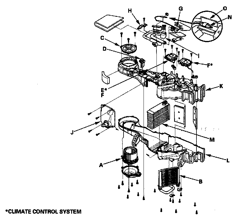 3. Remove the self-tapping screws and the lower housing (J). Remove the self-tapping screws, and carefully separate the left upper housing (K) from the right upper housing (L). Remove the rear evaporator core (M).