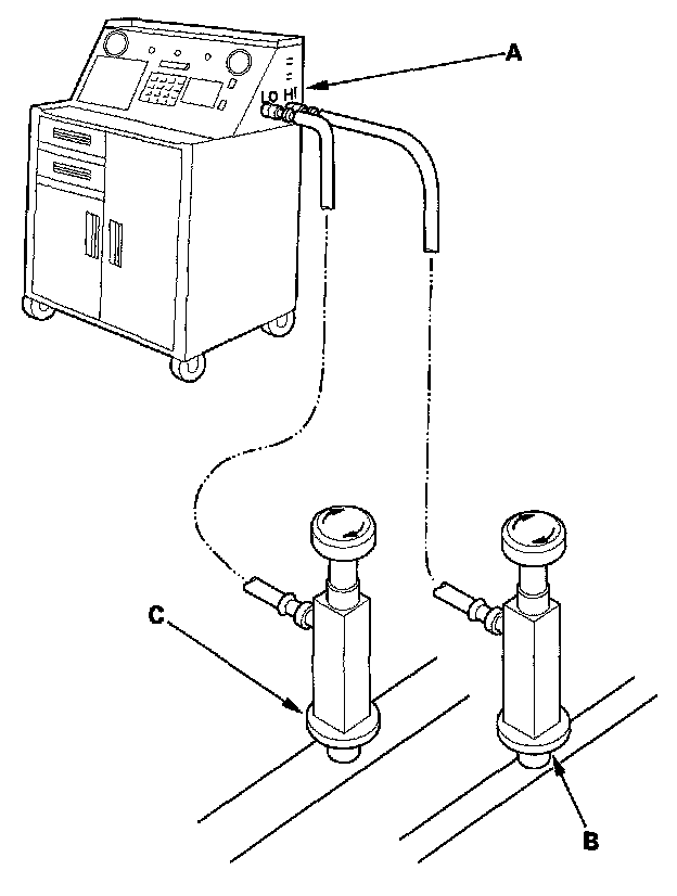 1. Connect an R-134a refrigerant recovery/recycling/charging station (A) to the high-pressure service port (B) and the low-pressure service port (C), as shown, following the equipment manufacturer's instructions.