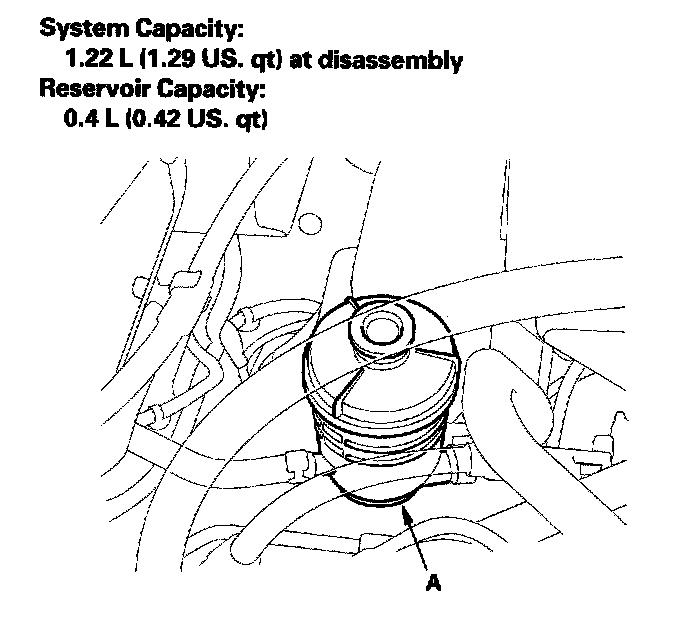 Fluid ReplacementCheck the reservoir (A) at regular intervals, and add the recommended fluid as necessary. Always use Honda Power Steering Fluid. Using any other type of power steering fluid or automatic transmission fluid can cause increased wear and poor steering in cold weather.