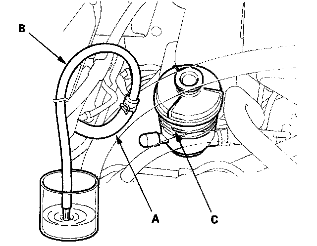 2. Connect a hose (B) of suitable diameter to the disconnected return hose, and put the hose end in a suitable container.