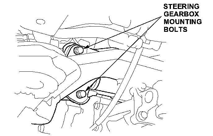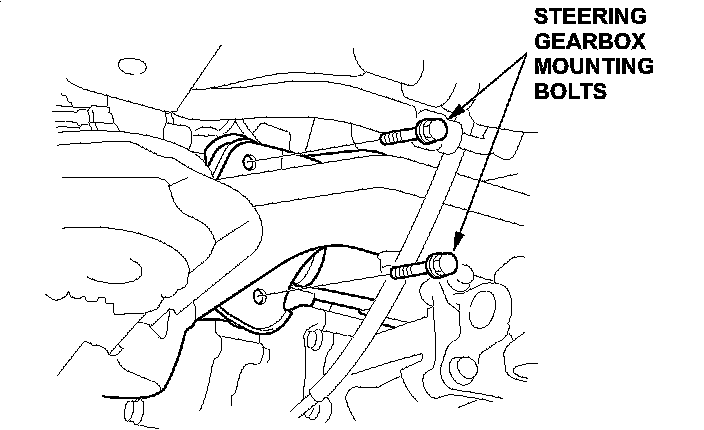 Replace the two steering gearbox mounting bolts in the pinion shaft area. Torque the new bolts to 58 N.m (43 ft-lb).