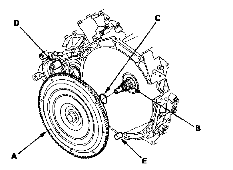 3. Install the 14 mm dowel pin (D) and 10 mm dowel pin (E) in the torque converter housing.