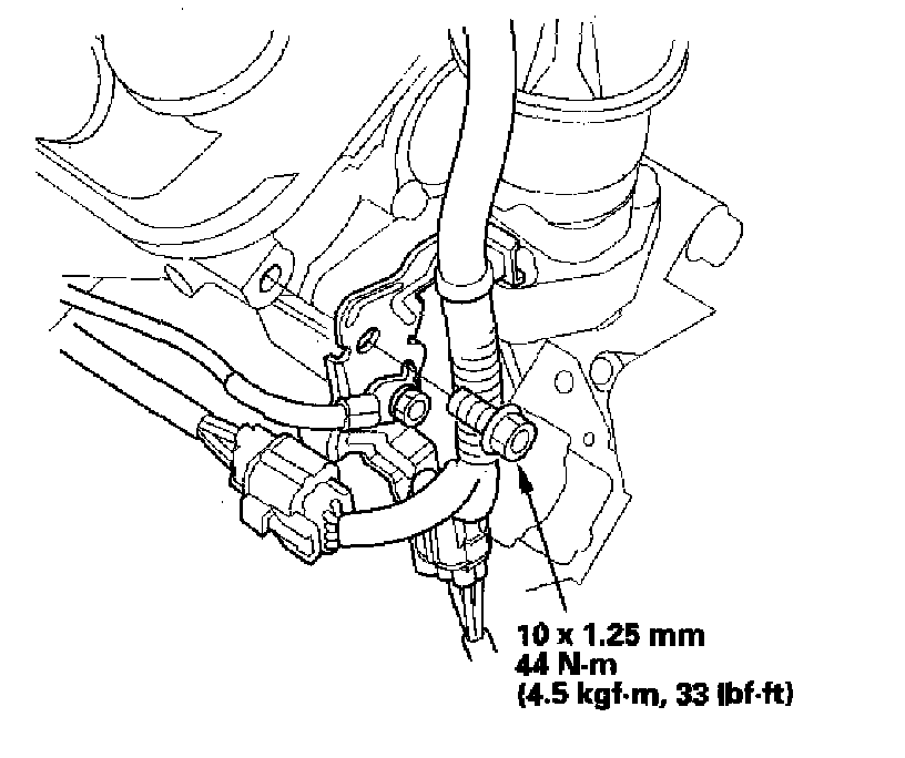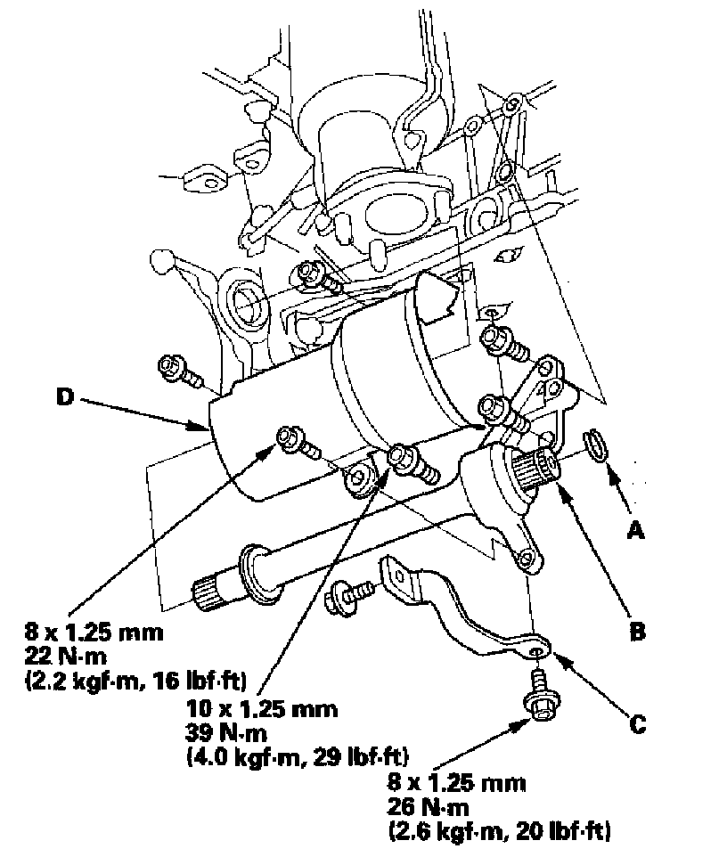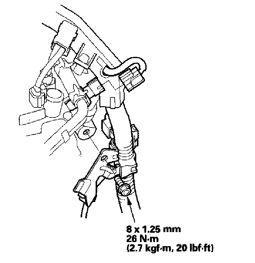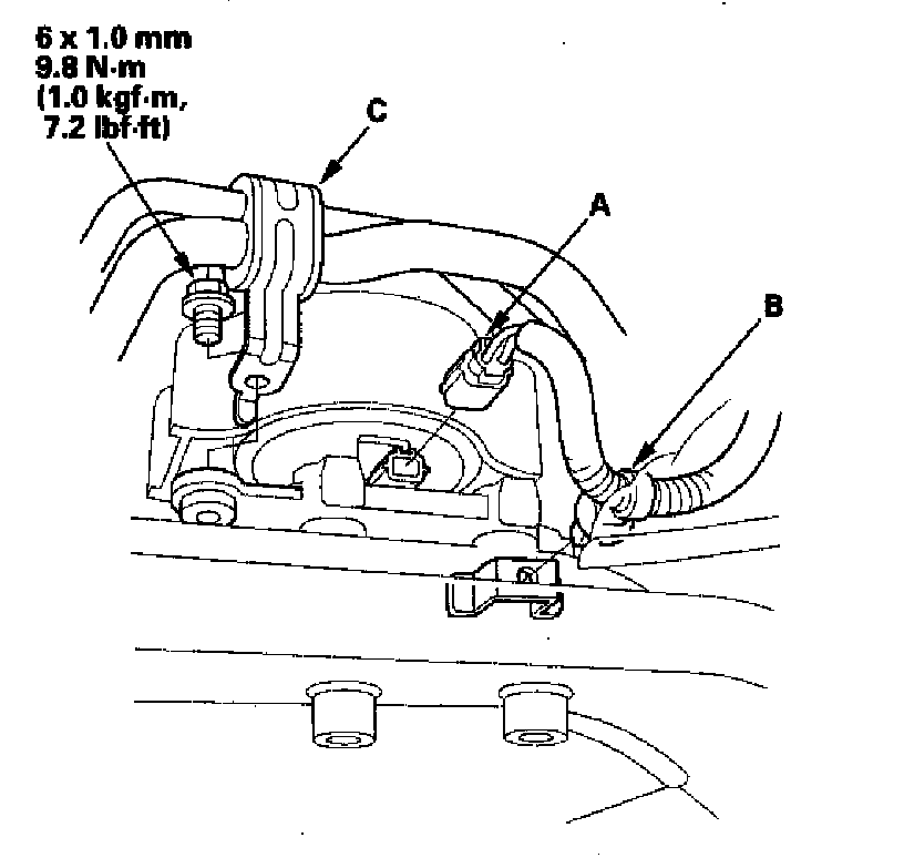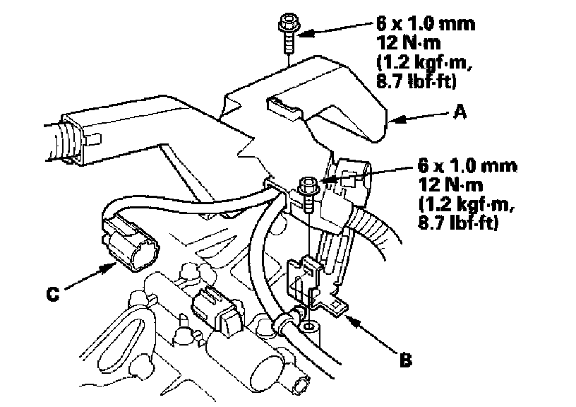 22. 2WD model: Connect engine control mount solenoid valve connector (A) on the rear engine mount, and install the harness clamp (B) on its bracket. Secure the power steering fluid line bracket (C) with the bolt on the rear mount bracket.
