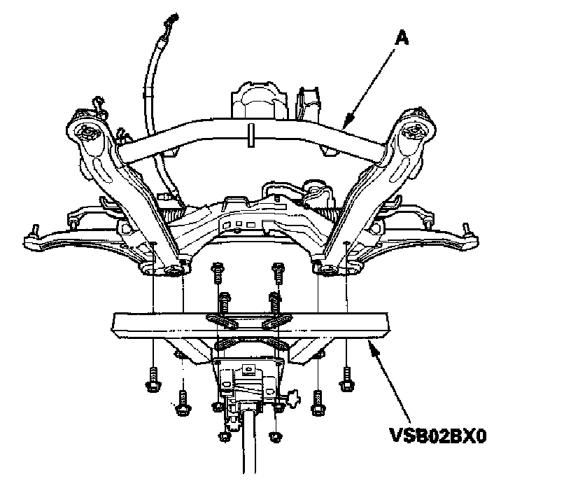 14. Support the front subframe (A) with the front subframe adapter (VSB02BX0) and a jack, and lift it up to the body.