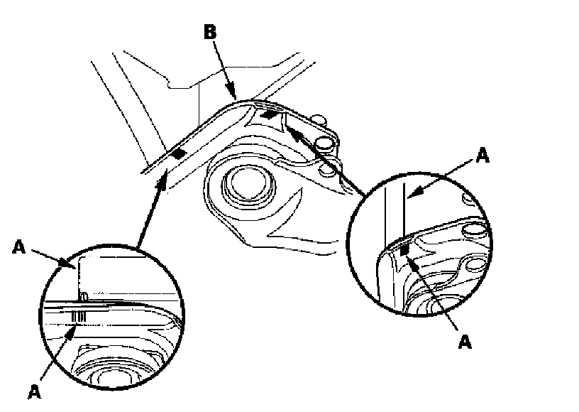 16. Align all reference marks (A) on the front subframe (B) with the body, then tighten the bolts on the front subframe to the specified torque.