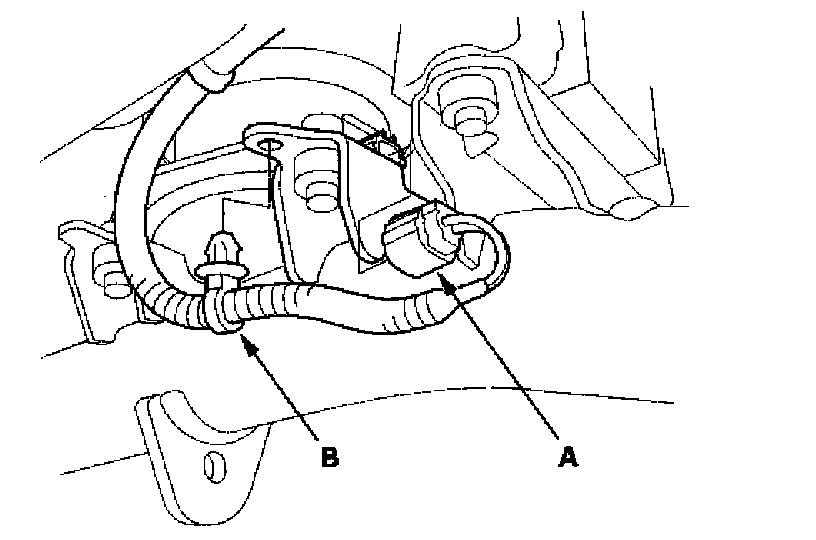 23. 2WD model: Connect engine mount control solenoid valve connector (A) on the front engine mount, and install the harness clamp (B) on the front subframe.