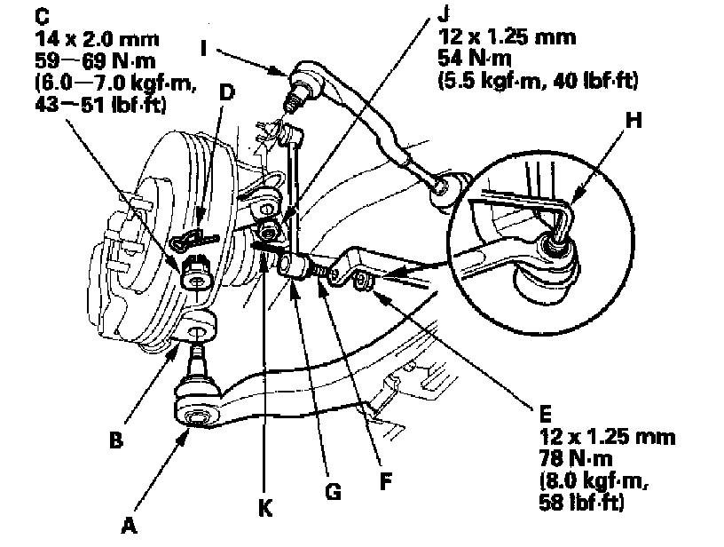 34. Install the tie-rod end ball joints (I) to each knuckle with the nuts (J) and new cotter pins (K).