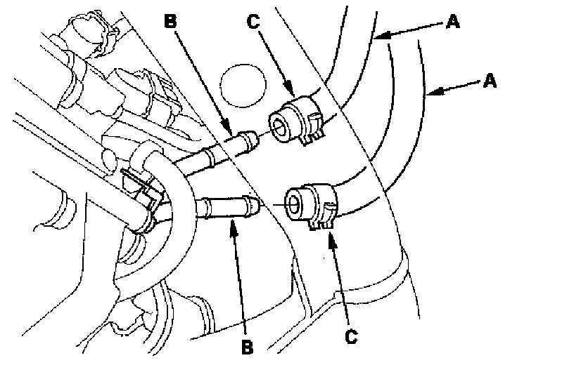 24. Connect the power steering fluid hose (A) to the line (B), and secure the hose with its hose clamp (C).