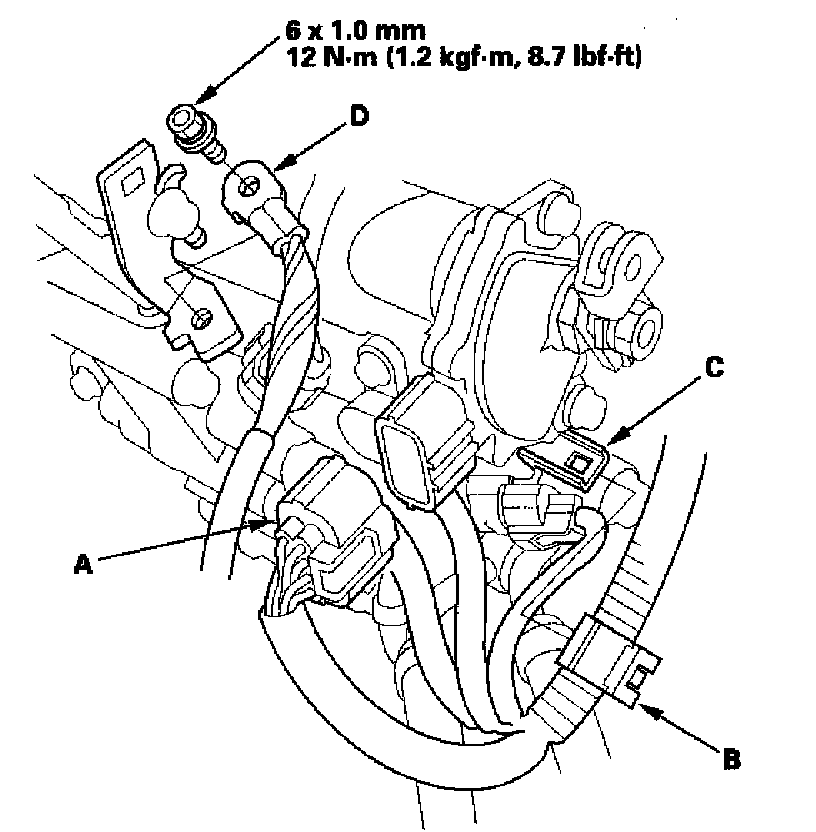 42. Connect the input shaft (mainshaft) speed sensor connector (A), output shaft (countershaft) speed sensor connector (B), ATF temperature sensor connector (C), and 3rd clutch transmission fluid pressure switch connector (D). Do not allow water, fluid, oil, dust, or other foreign particles to enter any of the connectors.