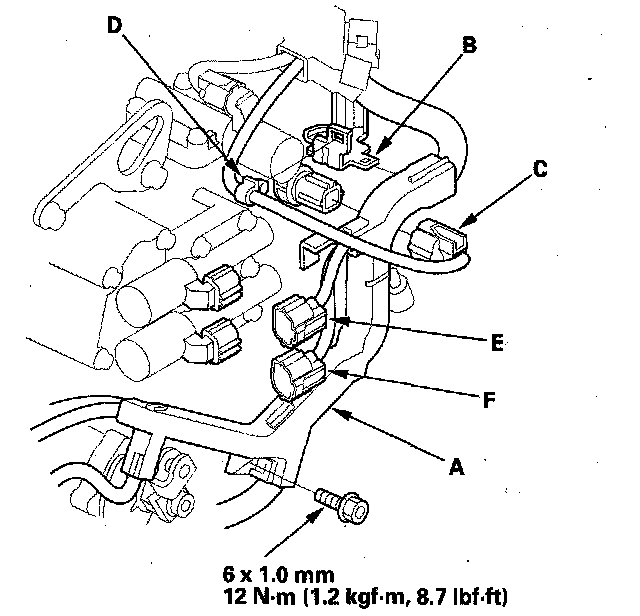 49. Connect the 4th clutch transmission fluid pressure switch connector (C), and install the harness clamp (D) on the bracket. Connect the A/T clutch pressure control solenoid valve A connector (E), and A/T clutch pressure control solenoid valve B connector (F).