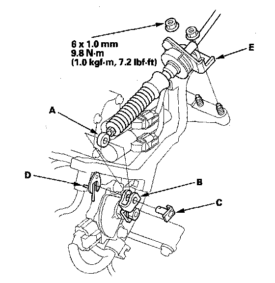 50. Attach the shift cable end (A) to the control lever (B), then insert the control pin (C) into the control lever hole through the shift cable end, and secure the control pin with the spring clip/washer (D).