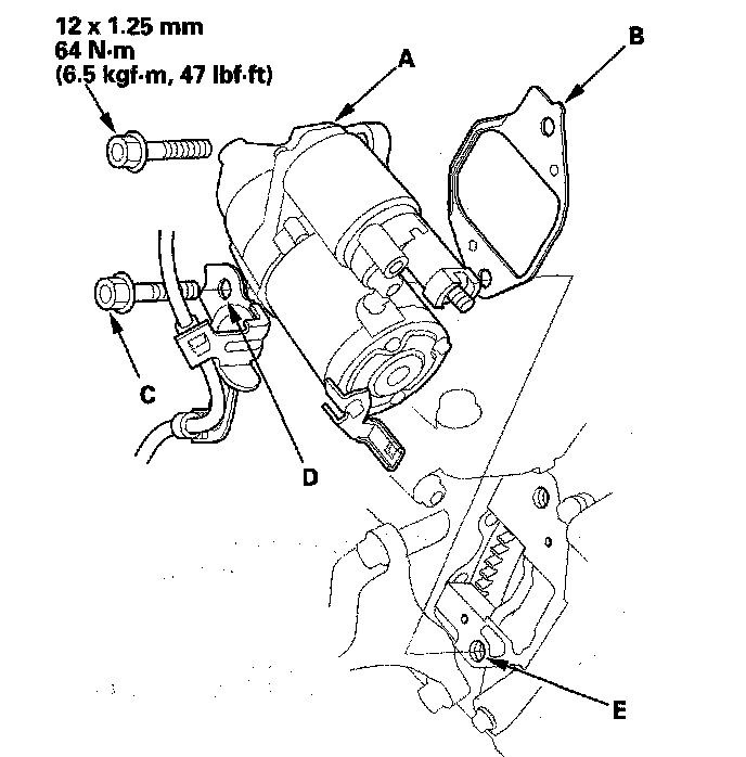 52. Install the starter (A) and new gasket (B). Install the mounting bolt (C) through the harness clamp bracket hole (D), and into the lower mounting bolt thread hole (E).
