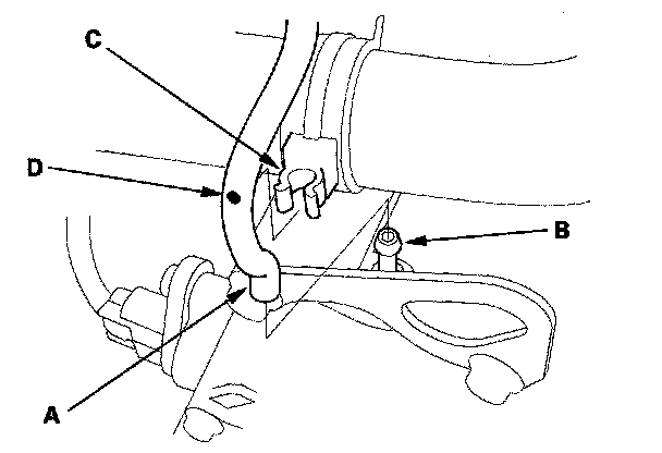 55. Install the transmission breather tube (A) over the breather pipe (B) at the transmission housing, and install the tube in the clamp (C) at the dot (D) on the tube with facing out.