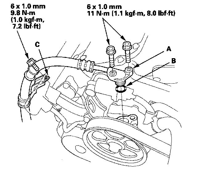 56. Install the power steering pump outlet line (A) with the new O-ring (B) to the pump, and secure the hose clamp (C) with the bolt.