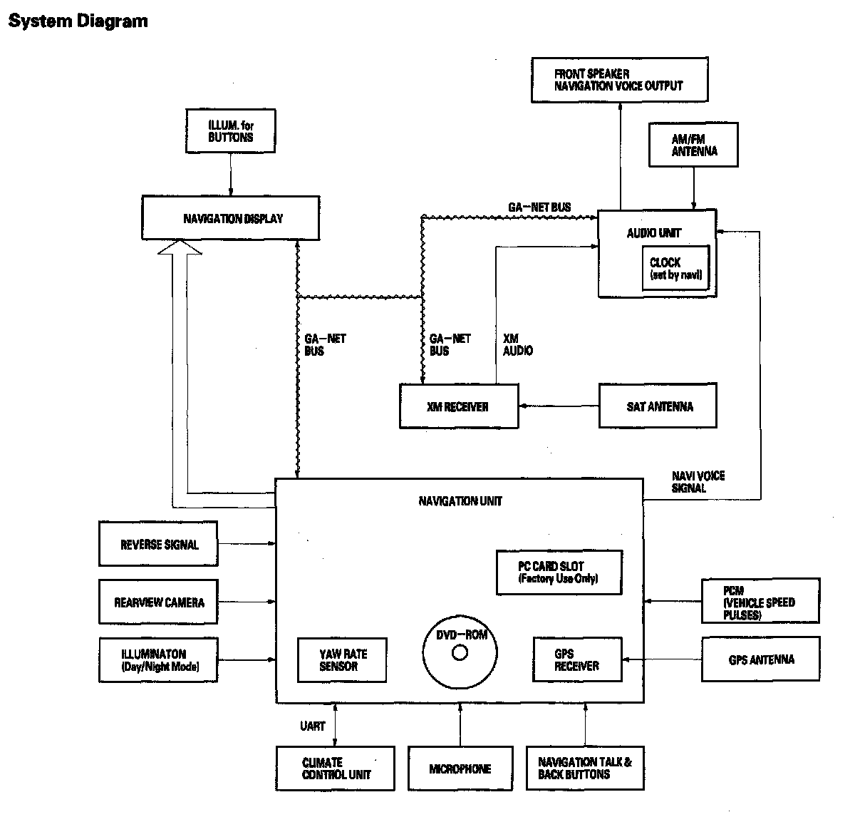 The GA-Net II bus passes information back and forth between the navigation display, the navigation unit, the climate control unit, and the audio system components. The information passed on this bus are touch button commands, audio muting signal, and audio (radio and XM), when commanded by voice control.
