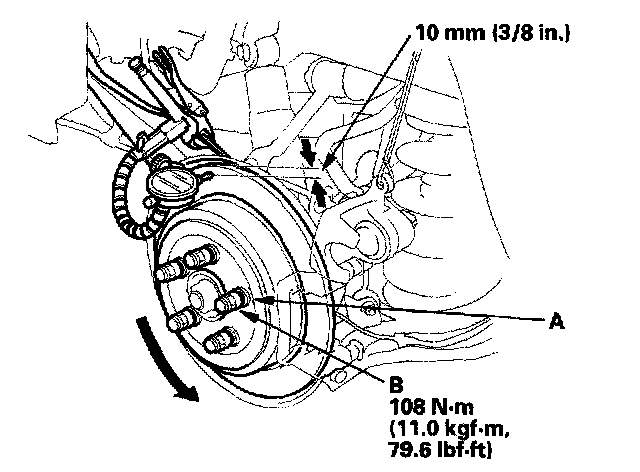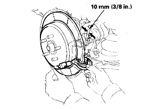 5. Set up the dial gauge against the brake disc/drum as shown, and measure the runout at 10 mm (3/8 inch) from the outer edge of the brake disc.