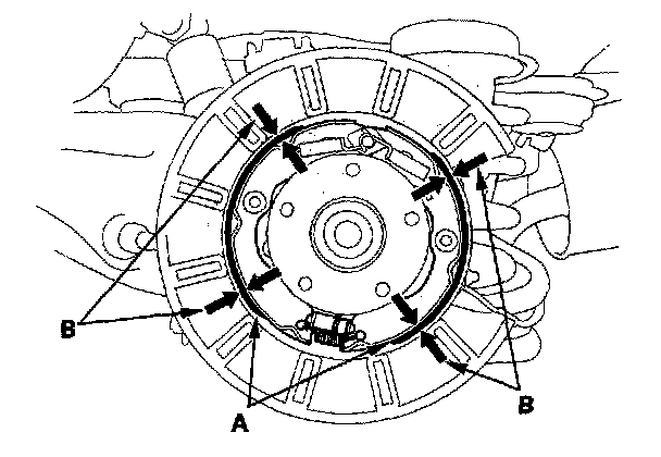 4. Measure the parking brake lining thickness (B). Measurement does not include brake shoe thickness.