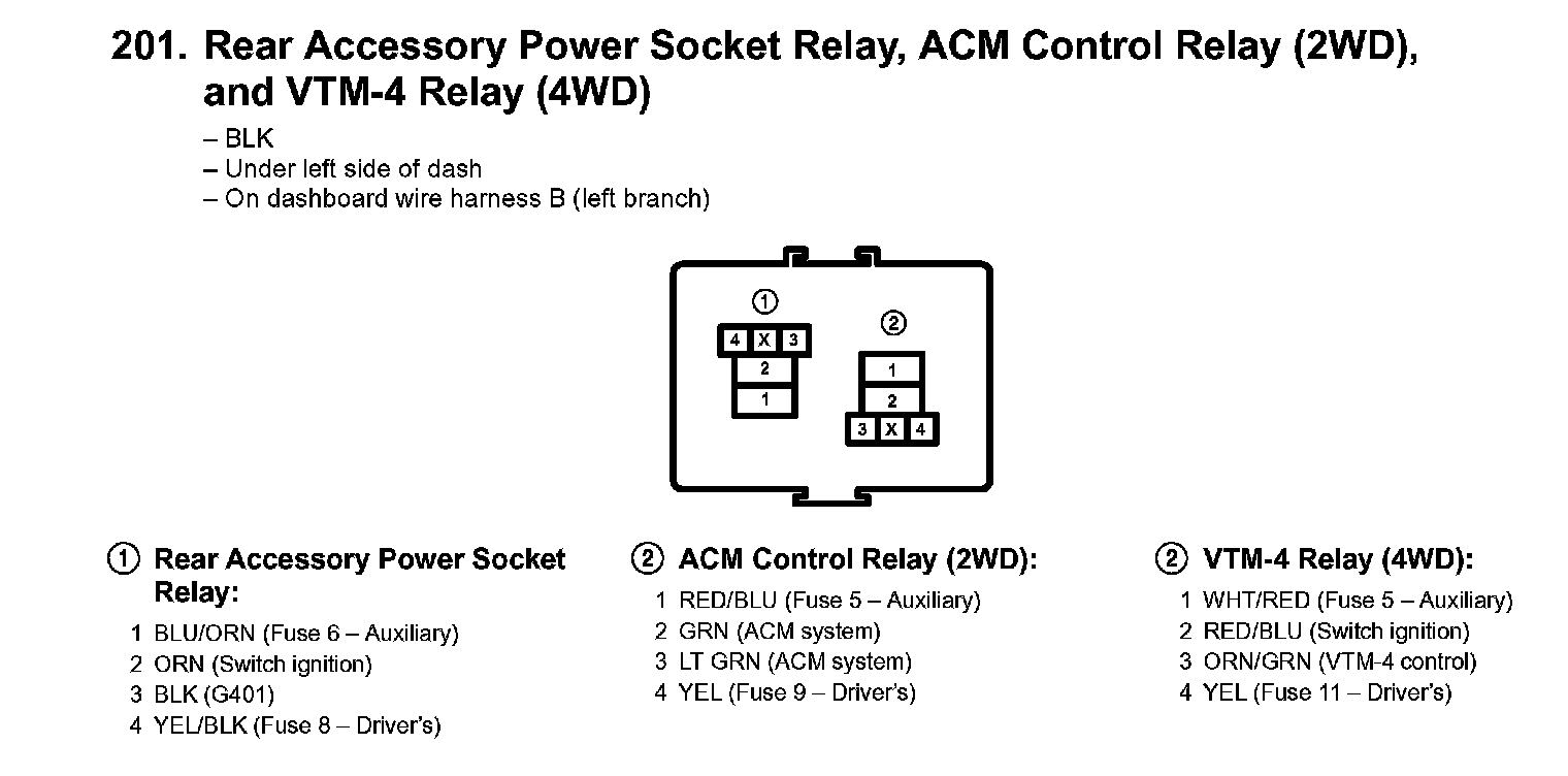 201. Rear Accessory Power Socket Relay, ACM Control Relay (2WD), And VTM-4 Relay (4WD):