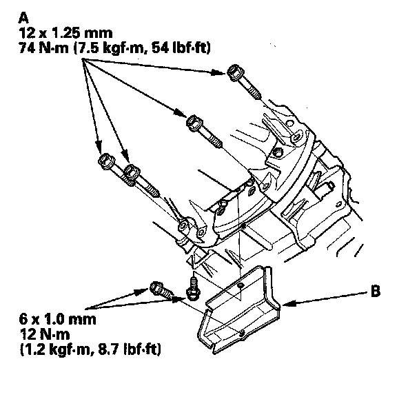 6. Tighten the four bolts (A) securing the transmission, then install the torque converter cover (B).