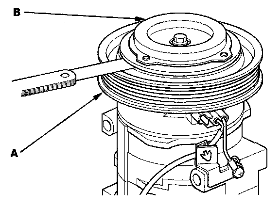 3. Measure the clearance between the pulley (A) and the pressure plate (B) all the way around. If the clearance is not within specifies limits, remove the pressure plate and add or remove shims as needed to increase or decrease clearance.