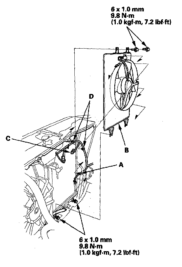 7. Remove the A/C compressor clutch harness clip (A) from the A/C condenser fan shroud (B), then disconnect the connector. Disconnect the A/C condenser fan connector (C), then remove the wire harness clips (D) from the A/C condenser fan shroud. Loosen the lower mounting bolts, then remove the upper mounting bolts and the A/C condenser fan shroud. Be careful not to damage the radiator fins when removing the A/C condenser fan shroud.