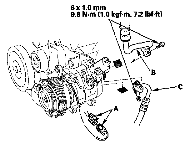 8. Disconnect the A/C compressor clutch connector (A) remove the bolt and the nut, then disconnect the suction line (B) and discharge line (C) from the A/C compressor. Plug or cap the lines immediately after disconnecting them to avoid moisture and dust contamination.