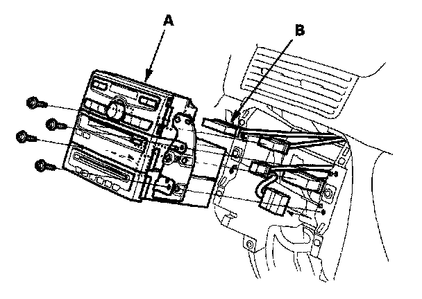 2. Remove the screws, and remove the climate control unit (A) with the brackets from the dashboard, then disconnect the connectors (B).