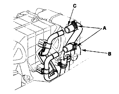 4. Slide the hose clamps (A) back, then disconnect the inlet heater hose (B) and the outlet heater hose (C) from the rear heater core. Engine coolant will run out when the hoses are disconnected; drain it into a clean drip pan. Be sure not to let coolant spill on the electrical parts or the painted surfaces. If any coolant spills, rinse it off immediately.