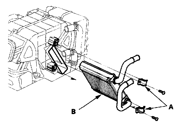 5. Remove the self-tapping screws and the clamps (A). Carefully pull out the rear heater core (B) so you don't bend the inlet and outlet pipes.