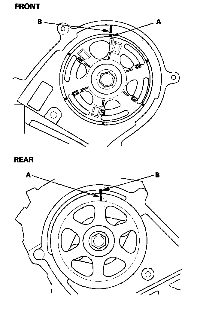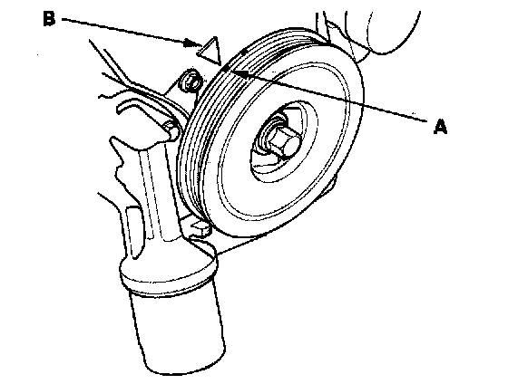 15. Turn the crankshaft pulley so its white mark (A) lines up with the pointer (B).