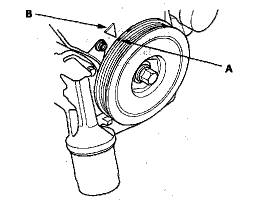 22. Turn the crankshaft pulley so its white mark (A) lines up with the pointer (B).