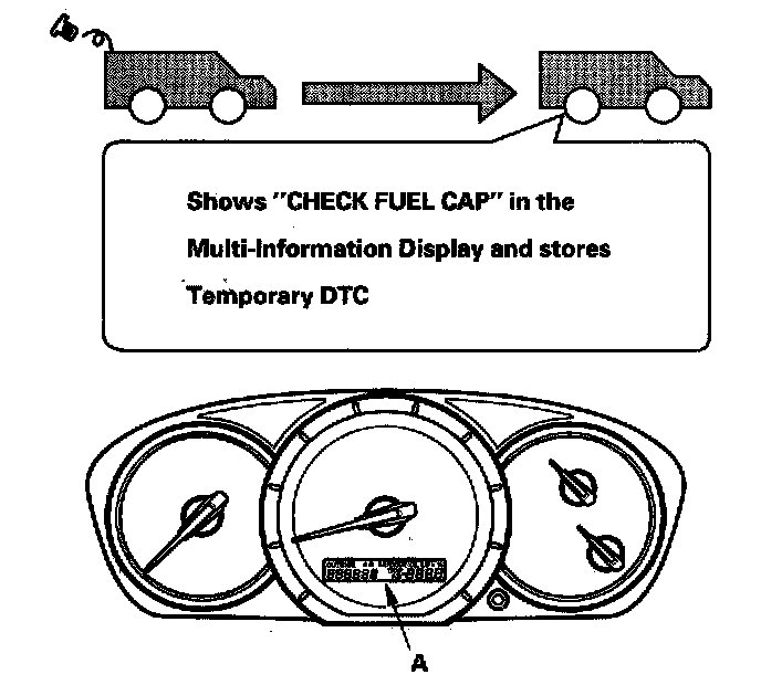 During the first drive cycle after a cold start, the PCM alerts the driver to check the fuel fill cap by showing a "CHECK FUEL CAP" message in the odometer/outside temperature display (A), and it Stores Temporary DTC P0457 "Evaporative Emission (EVAP) System Leak Detected/Fuel Fill Cap Loose or Missing". Tightening the fuel cap does not make the message go off immediately.