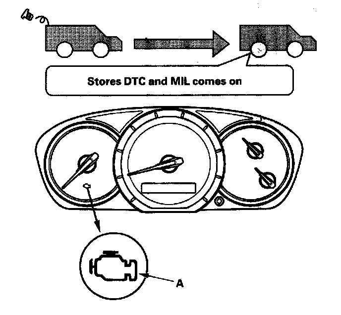 During the third drive cycle after a cold start, if the fuel fill cap is still loose or missing, the PCM stores DTC P0457 "Evaporative Emission (EVAP) System Leak Detected/Fuel Fill Cap Loose or Missing". The malfunction indicator lamp (MIL) (A) comes on, and the "CHECK FUEL CAP" message goes off.