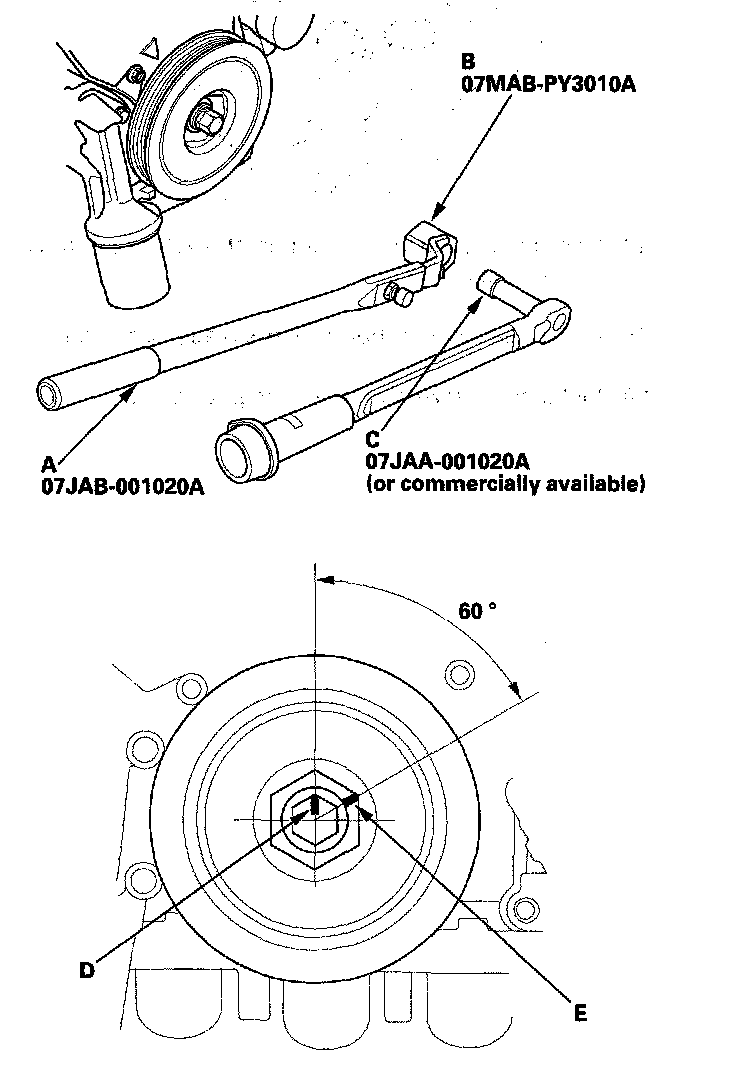 - 2 Mark the bolt head (D) and crankshaft pulley (E) as shown, then tighten the bolt an additional 60° (The mark on the bolt head line up with the mark on the crankshaft pulley).