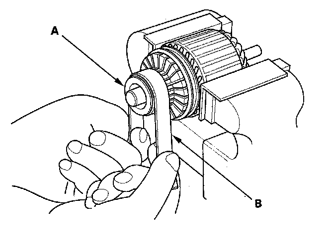 7. Check the commutator (A) surface. If the surface is dirty or burnt, resurface with emery cloth or a lathe within the following specifications, or recondition with #500 or #600 sandpaper (B).