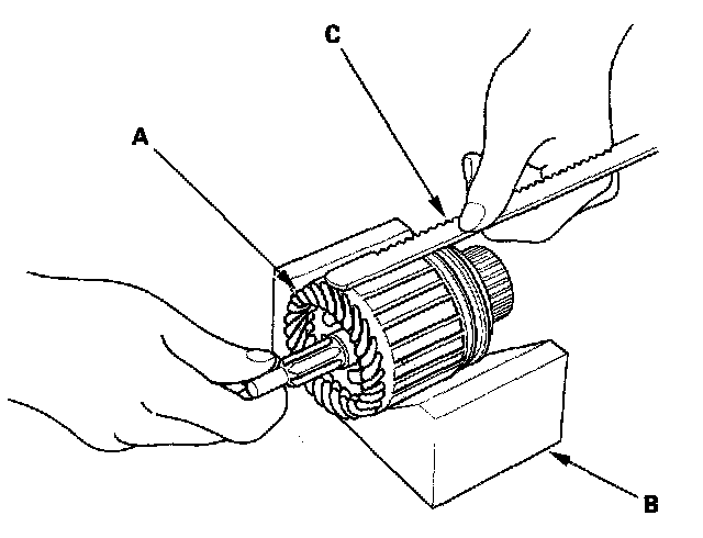 12. Place the armature (A) on an armature tester (B). Hold a hacksaw blade (C) on the armature core. If the blade is attached to the core or vibrates while the core is turned, the armature is shorted. Replace the armature.
