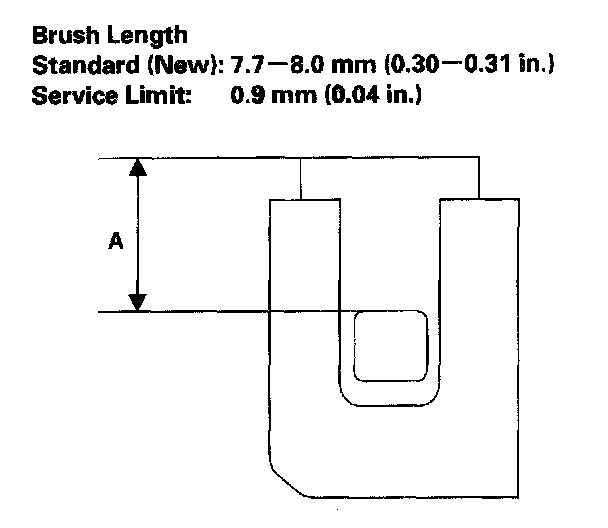 14. Measure the brush length (A). If it is shorter than the service limit, replace the brush holder assembly.