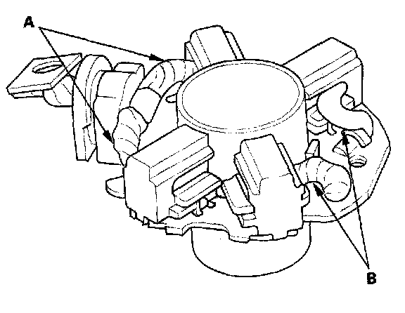 15. Check for continuity between the (+) brush (A) and (-) brush (B). If there is continuity, replace the brush holder assembly.