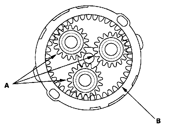 16. Check the planetary gears (A) and ring gear (B). Replace them if they are worn or damaged.