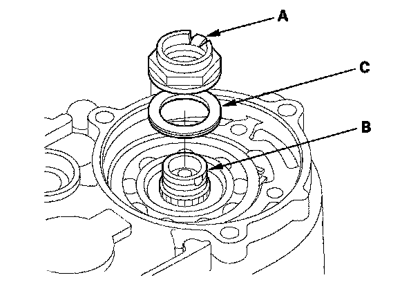 16. Cut the lock tab (A) of the mainshaft locknut (B) using a chisel (C).
