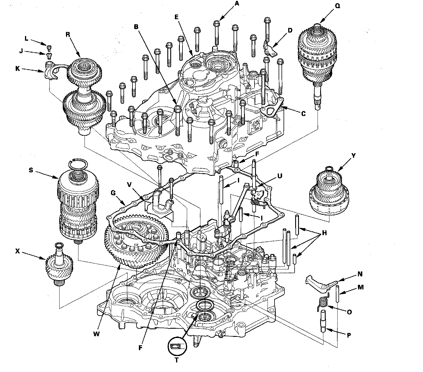 28. Remove the mainshaft (Q), countershaft (R), shift fork, and secondary shaft (S) together, and remove the needle bearing (T) from the torque converter housing.