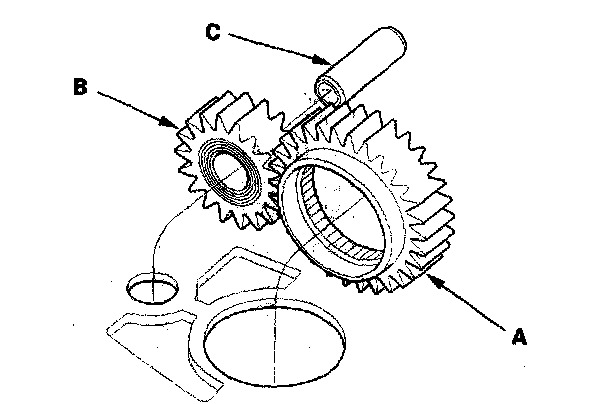 2. Install the main separator plate and two dowel pins on the torque converter housing. Then install the ATF pump drive bear (A), driven gear (B), and ATF pump driven gear shaft (C). Install the ATF pump driven gear with its grooved and chamfered side facing down.