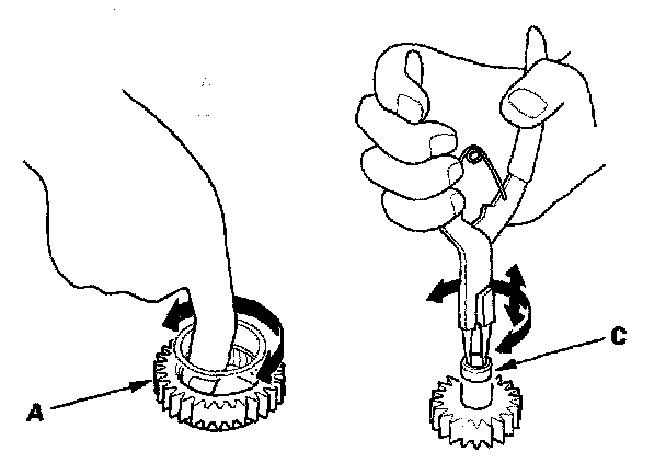 4. Install the main valve body (seven 6 mm bolt and three 8 mm bolts). Make sure the ATF pump drive gear (A) rotates smoothly in the normal operating direction, and the ATF pump driven gear shaft (C) moves smoothly in the axial and normal operating direction.