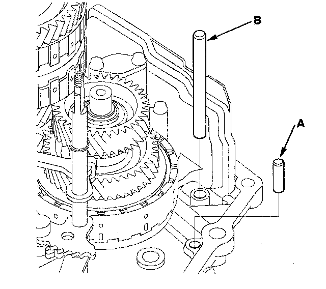 17. Install the intermediary shaft (A) into the main valve body, and install the 26.5 mm washer (B) on the top of the intermediary shaft.