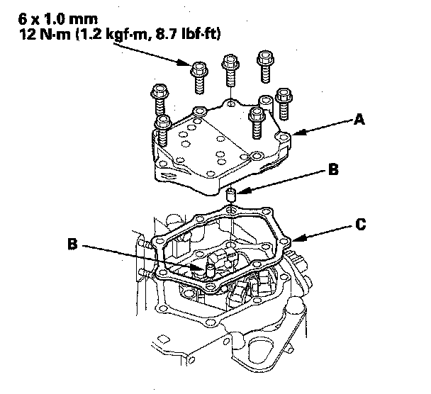 52. Install the solenoid valve cover (A) with the two dowel pins (B) and the new gasket (C), and secure it with the seven bolts.