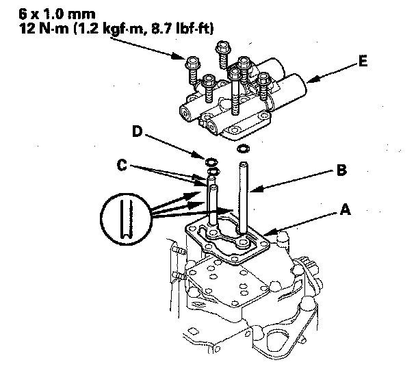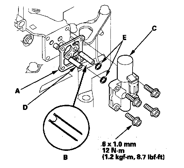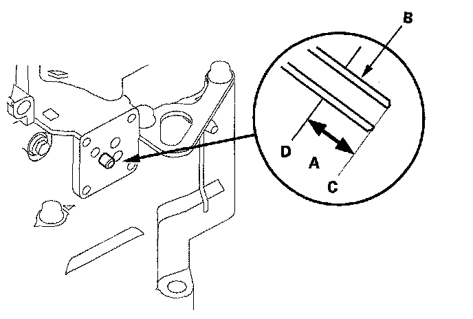 56. Check the height (A) if the 8 x 53 mm ATF joint pipe (B) between the top (C) of the pipe and solenoid valve body mounting surface (D). The height is about 7 mm (0.3 inch). If the height is over 7 mm (0.3 inch), install the pipe securely until it stops the accumulator body.